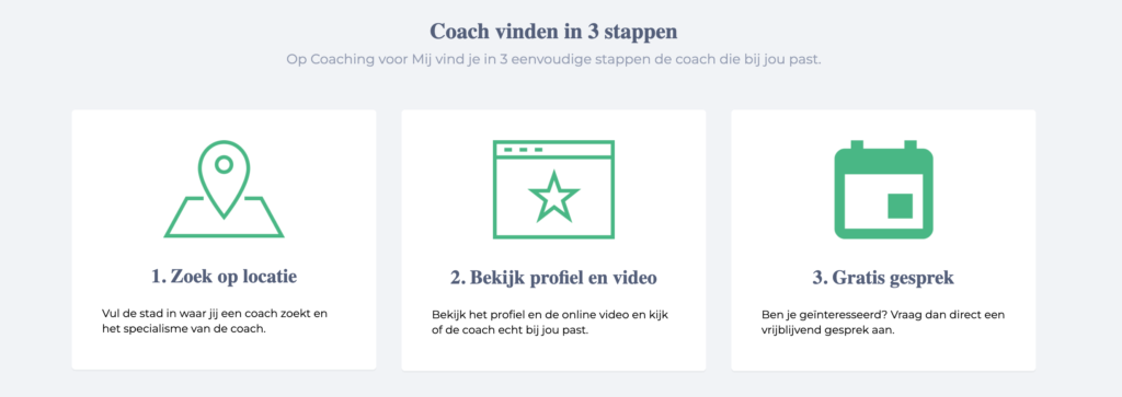 Coaching Voor Mij is een platform waar coaches gevonden kunnen worden op basis van locatie en specialisatie. Het platform hanteert een no cure no pay-model, waarbij een eenmalige acquisitievergoeding per cliënt wordt betaald als er daadwerkelijk een betaalde opdracht uit voortkomt. Dit kan aantrekkelijk zijn voor coaches die alleen willen betalen voor succesvolle leads.